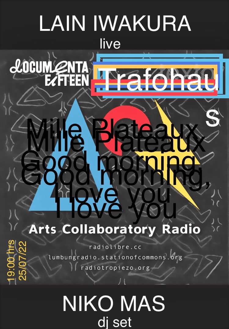 Production of two concerts featuring Lain Iwakura (Mille Plateaux/O Graz), Niko Mas (CDCY), and Klaus Masuda (O Graz), for lumbung radio at Documenta Fifteen, on behalf of Station of Commons. The concerts took place at Trafohaus, hosted by the collective Arts Collaboratory and Radio Tropiezo.