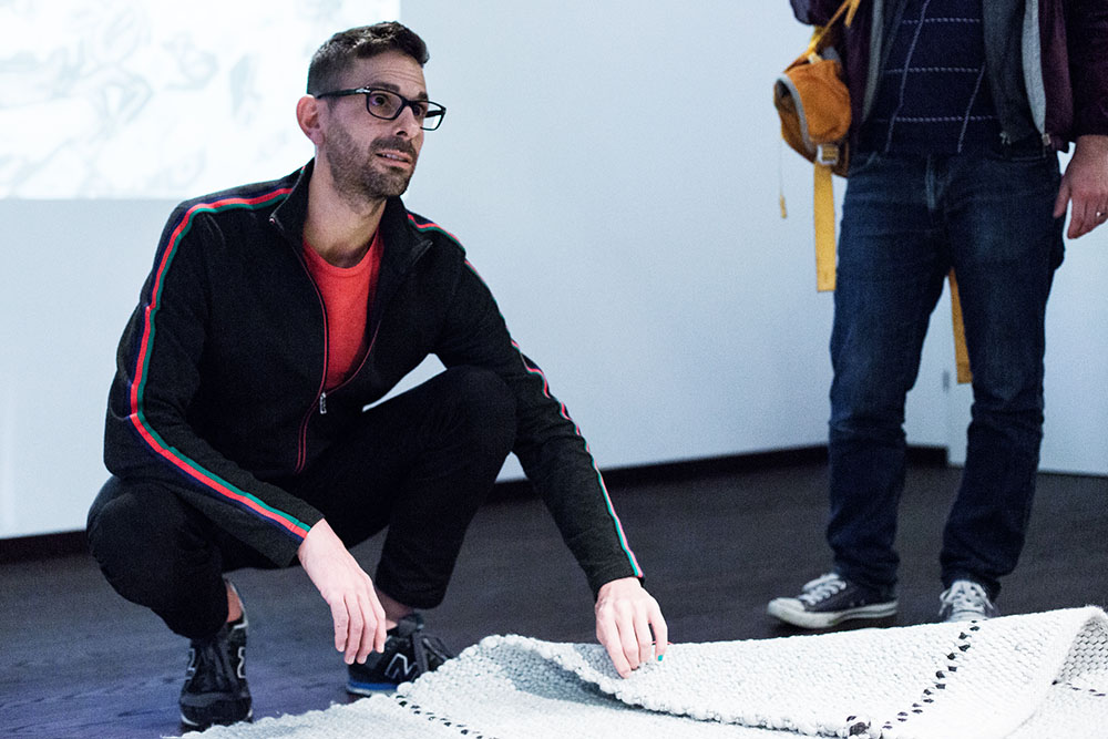 “Sonic Rug is the result of an artistic approach to smart textiles. The project is exploring the possibilities of connecting soft material to the digital space, manifesting the results within an interactive installation, that creates sounds by touch. […] In this Hackathon data from the touch-sensitive installation will be open to be translated into different media.”1